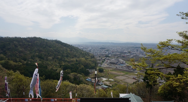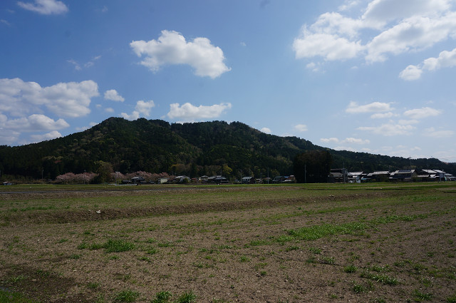 駅前から正面に見えるとんがった山が赤神山357.2m 別名太郎坊山
