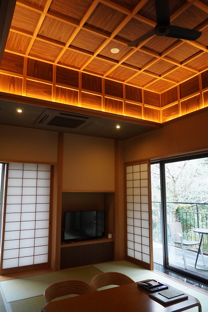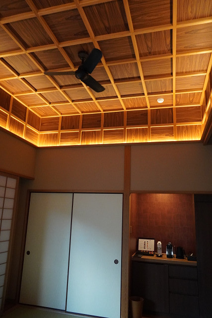 天井は折上げでファンが回っている コーヒーもしっかり飲める