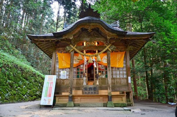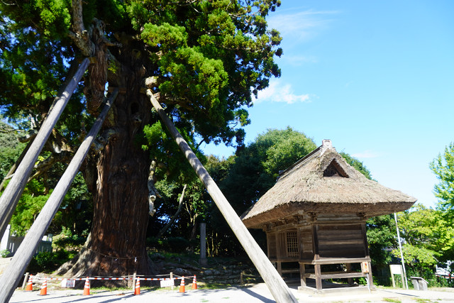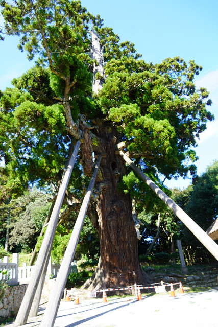 参道の神門をくぐると右側にある八百(やお)杉は樹齢約2000年と言われ、伝説では不死となった八百比丘尼が植えたとされます。根本の洞穴には大蛇が閉じ込められ、木の中から大蛇の大いびきが聞こえてくるとも伝えられています。