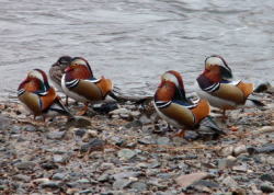 伯備線の鉄橋から見れる日野川には多くのオシドリが群れる 観察小屋もあるそうだ