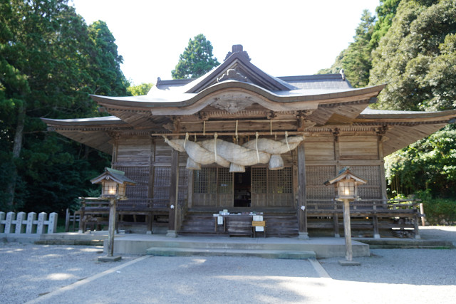 玉若酢命神社の本殿の造営は寛政5年(1793年)で、隠岐の総社です。隠岐造りといわれる建築形式で、屋根は茅葺き、千木(ちぎ)、堅魚木(かつおぎ)のうえに、雀踊(すずめおどり)と呼ぶ横木がおかれ、素朴ななかにも威厳のある建造物です。