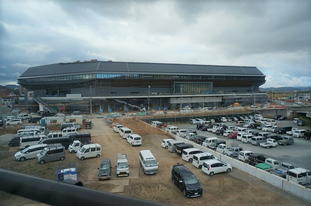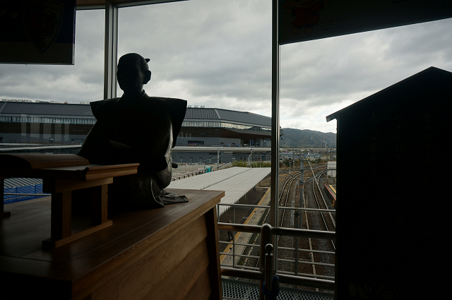 駅には明智光秀の像や駅前には「京都サンガ」の本拠地となるサッカー場が建設中である