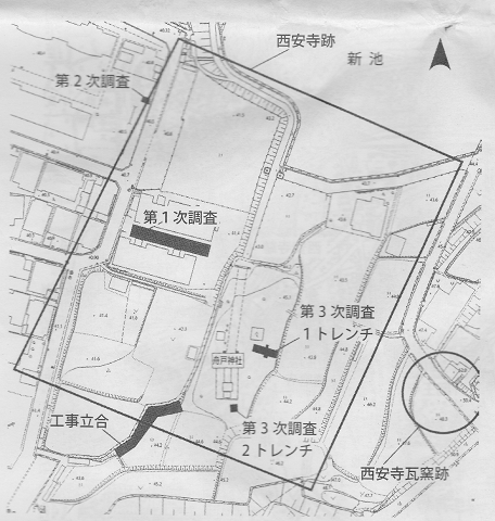 四天王寺式伽藍が存在したようで瓦から7世紀前半という