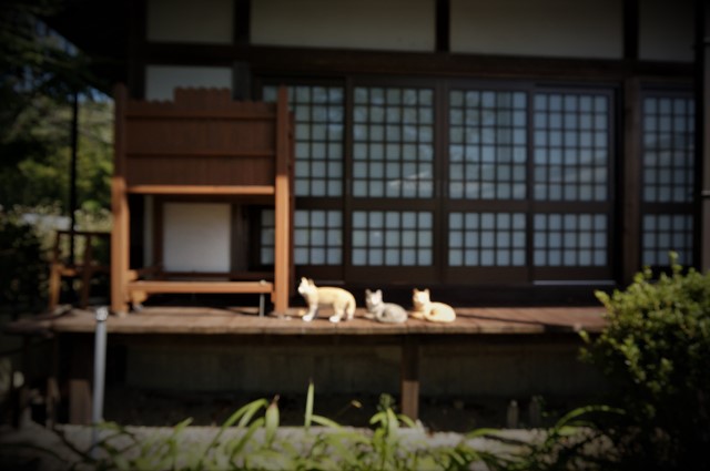 東塔の礎石と本堂の縁側の陶器の猫