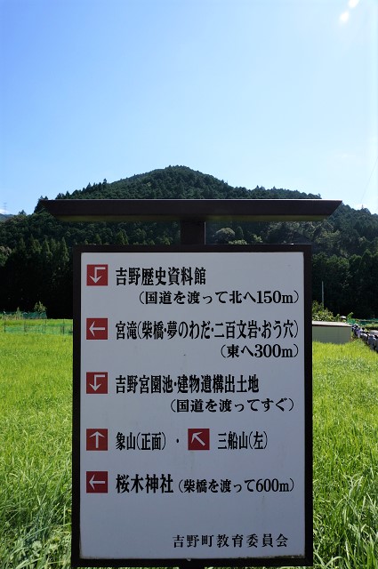 吉野川を挟んで宮滝遺跡の南対岸には万葉集に登場する象山(きさやま)と三船山が目の前にそびえている