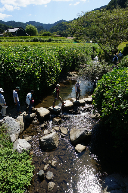 石舞台付近でバスを降りミハ山を見その麓にある飛鳥稲淵宮殿跡マラ石・稲淵の棚田を通り男綱(おずな)・飛び石