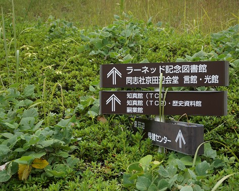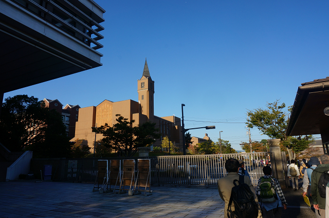 丘を下りJR線・近鉄線の踏切を超えて山手の同志社大学南門に向かう