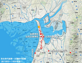 西は「茅淳(ちぬ)の海」現大阪駅など市街は殆ど海中である