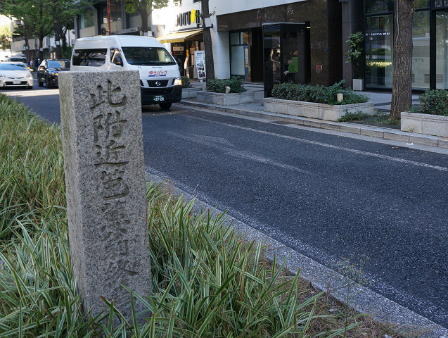 地上に上がると御堂筋のグリーン帯にぽつりと石碑がある