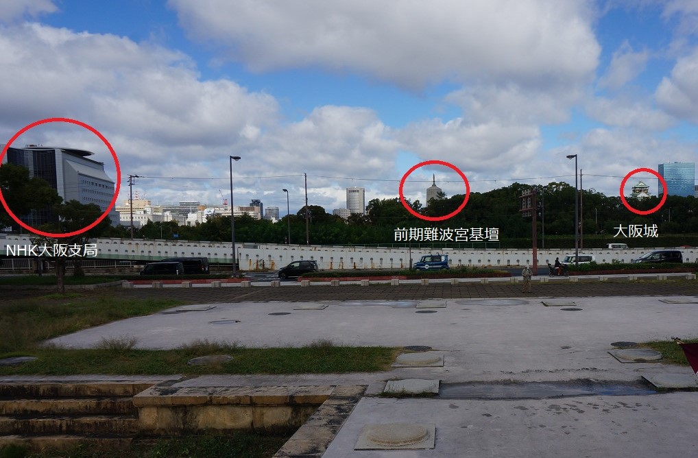 信号を渡った前に後期難波宮が広がっている