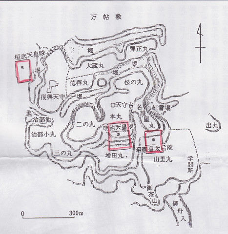 しかし13世紀後半に桓武陵が盗掘された時の記録から 山田邦和氏は 明治天皇陵の西北 二の丸跡にあたる