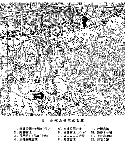 このうち最も古いのは1.桜井公園二号墳で、これは、大和で造られた最初の横穴式石室でもあります。出土品としては、五世紀後半の須恵器とともに炊飯器と、銀の簪があり、渡来系のものです。