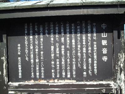 境内はかなり広いので掘ればかなりの遺構も期待される。 そこから歩いて25分天の川を挟んで香里団地の一角にぽつんと取り残されたような高台がある。中山観音寺跡である。今は団地開発でほとんど消失しているが出土品に瓦類他方形三尊磚仏や青銅製の懸仏 北宋銭などがある。特に