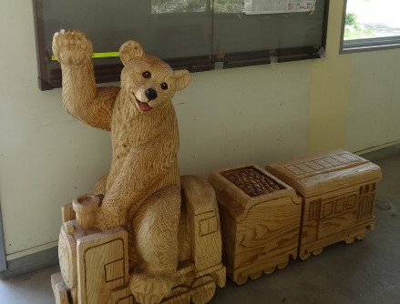 無人の長門峡駅では木彫りの熊が迎えてくれる