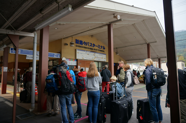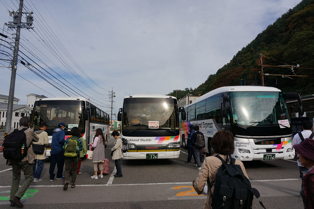 終点の新島々の駅前にはバスが3台待ち受けていて