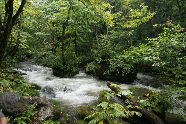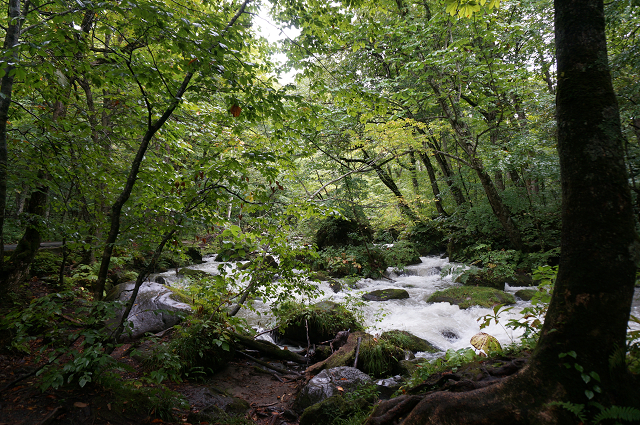 奥入瀬は紅葉に早く 雨で増水し水が濁っていた