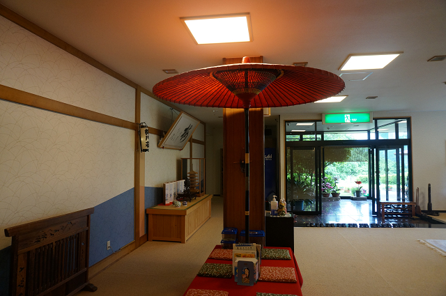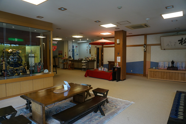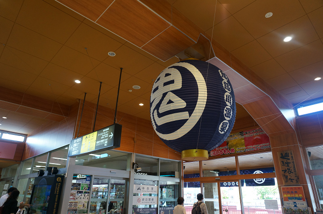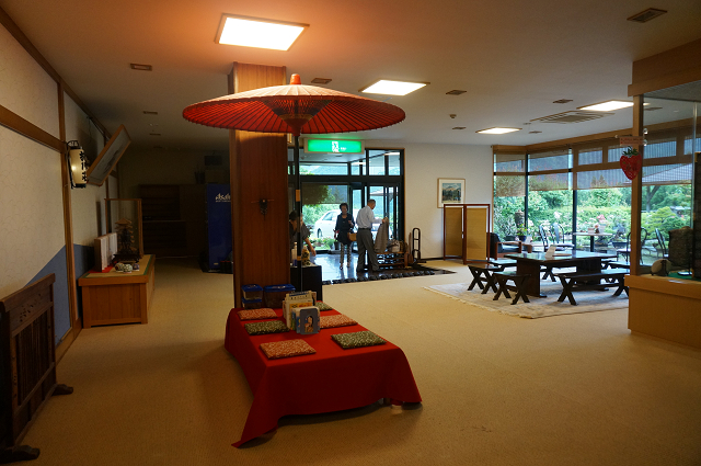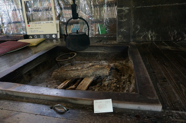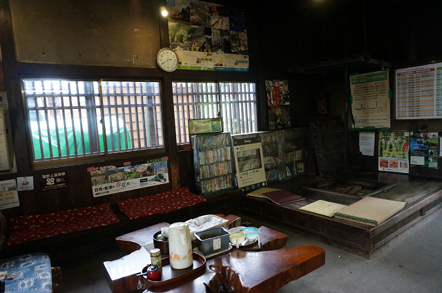 駅には土産物と自由に飲めるお茶と囲炉裏がある