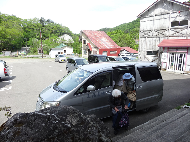 宿の叔母さんに相談すると「鶴の湯」の送迎バスがこの先のバス停まで来ているから運転手さんに頼んだら大丈夫だよ