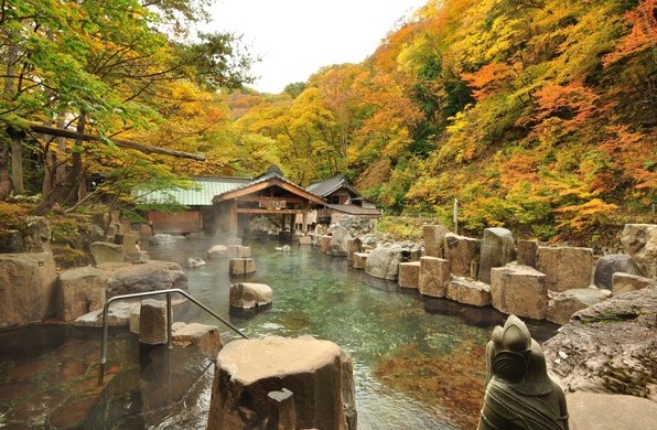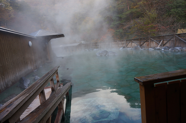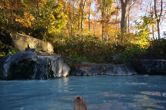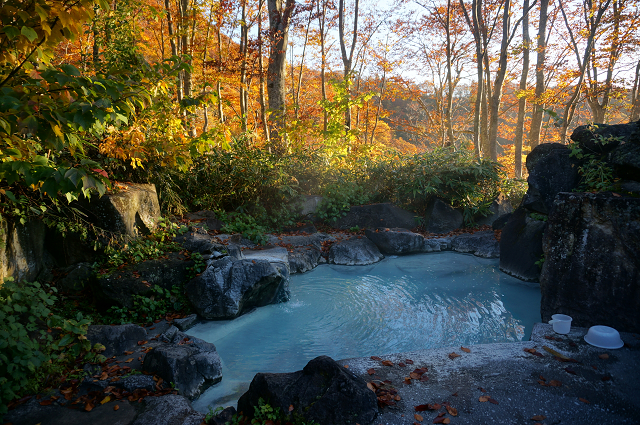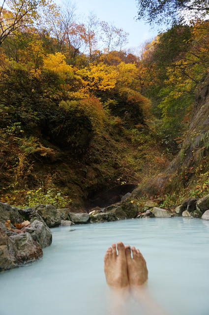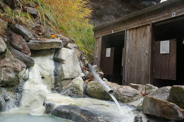 錦繍の中にイオウ臭の真っ白な湯 これが温泉だ!と言わんばかり