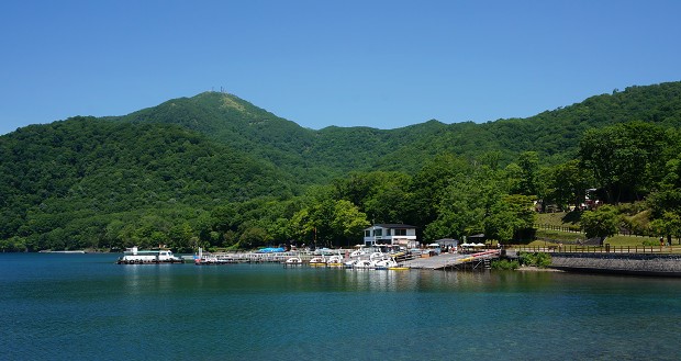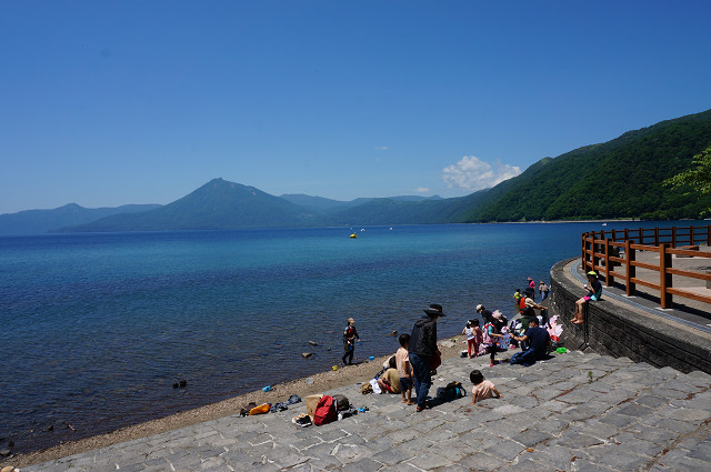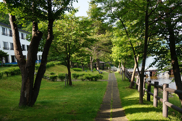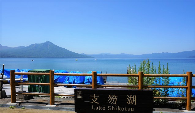 ベンチの後ろが休暇村支笏湖とある