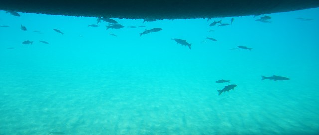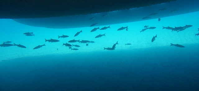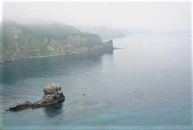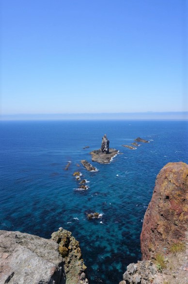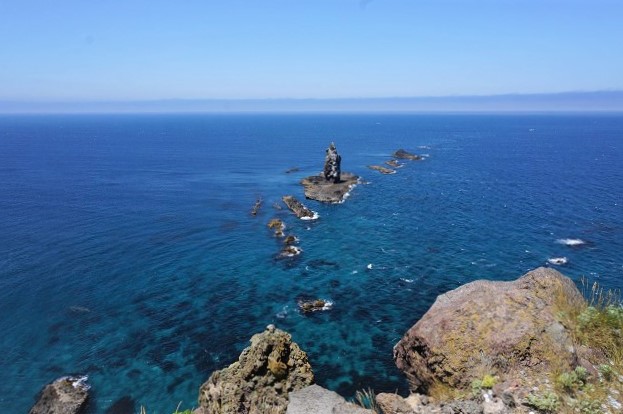 船の底がグラスのボート 火山の溶岩が冷えて固まった六角列柱だ