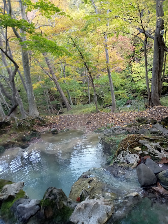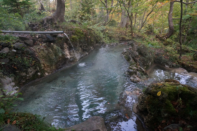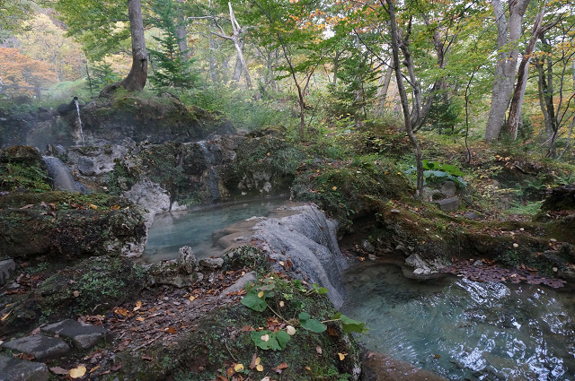 木々の合間にエメラルドの温泉が