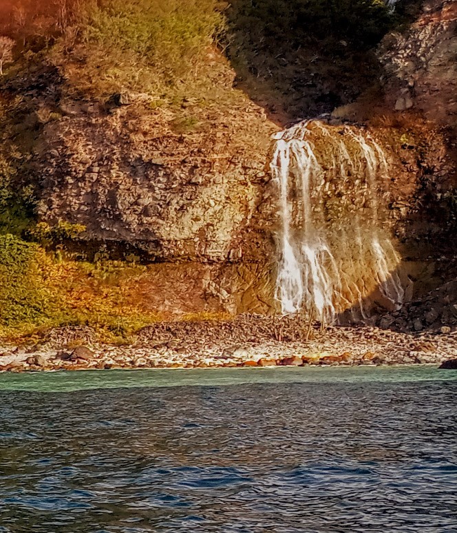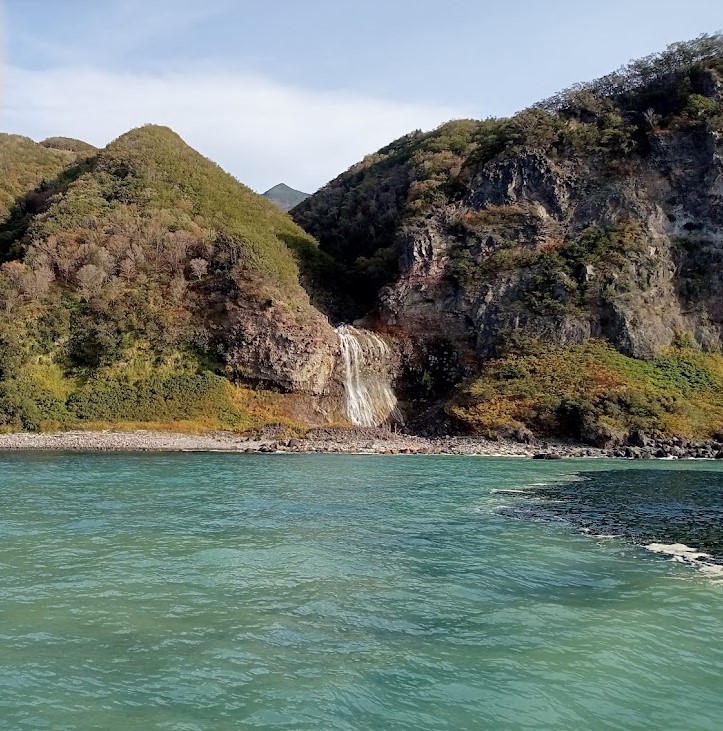 硫黄山からの水は硫黄滝となり海に注ぐ