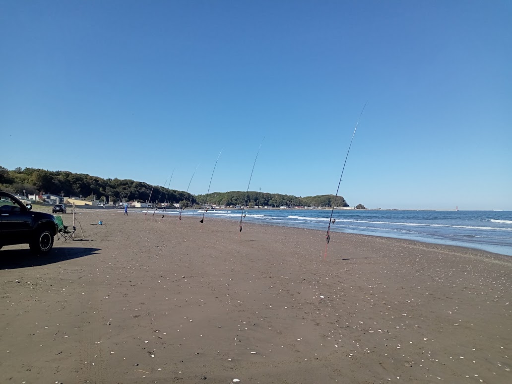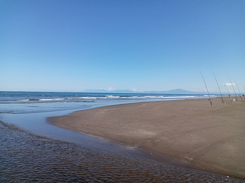 川が海に出会う浜には大勢の釣り人が何十本もの釣り竿を立てている