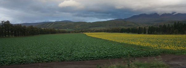 (堆肥用の菜の花と甜菜畑と知床連山)