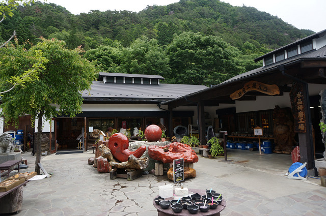 沿道には渓谷で産出する水晶や宝石の原石や加工品の店が並ぶ