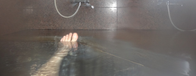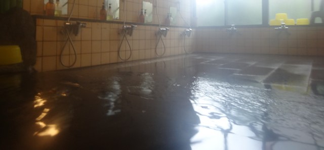 貸し切り湯のほうの洗い場も1cm位湯にあふれている いい湯だ