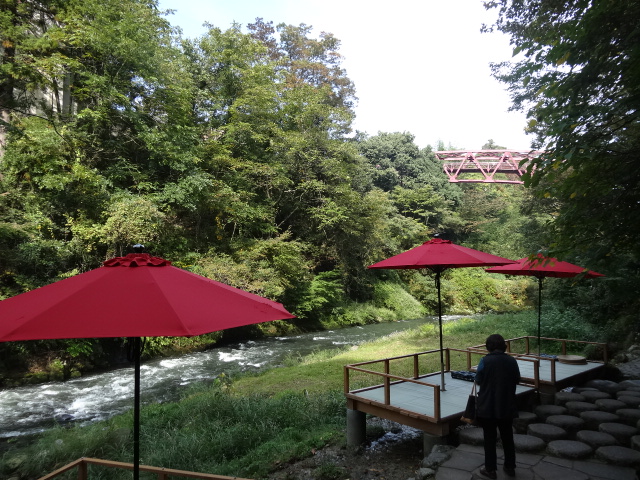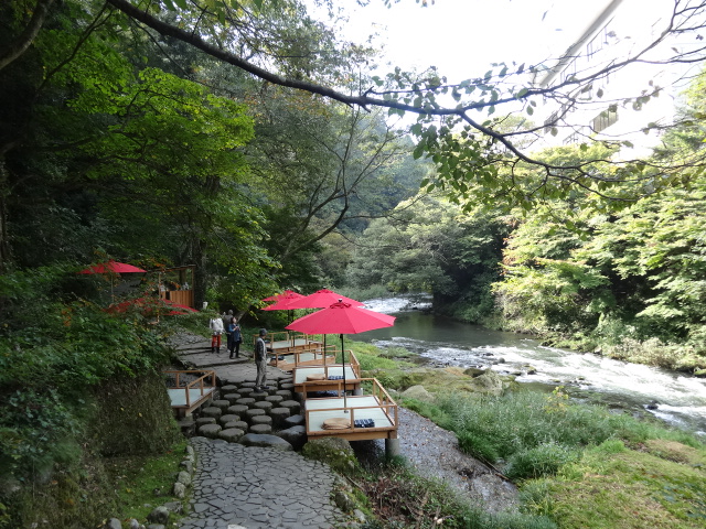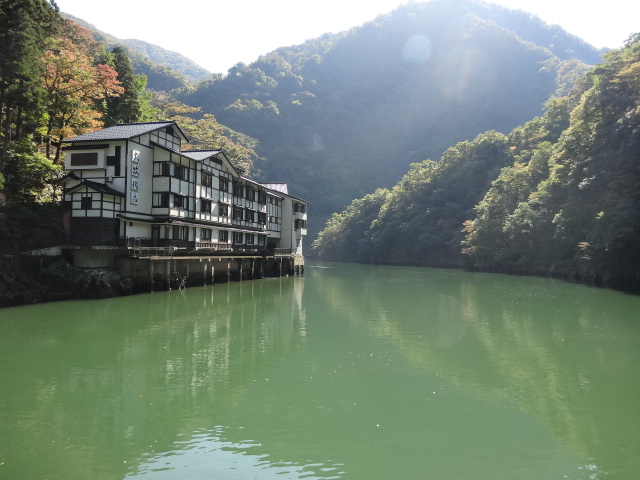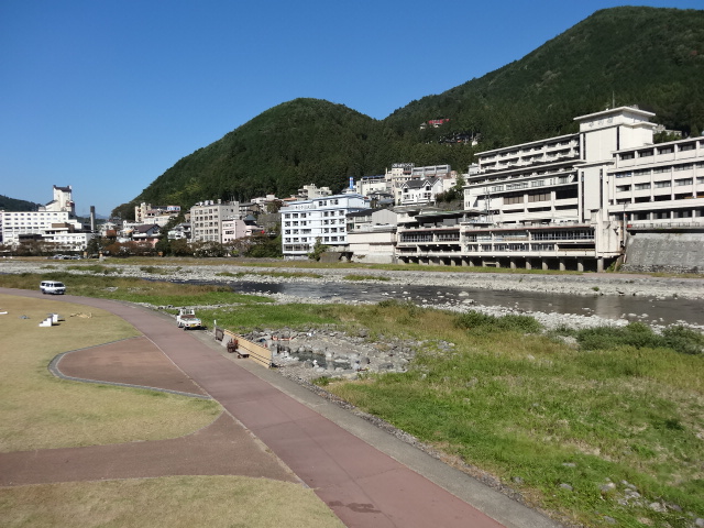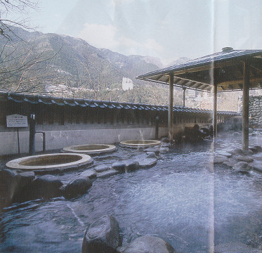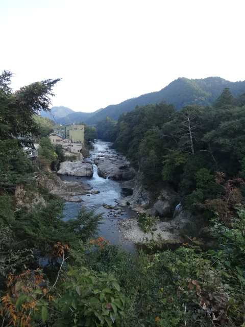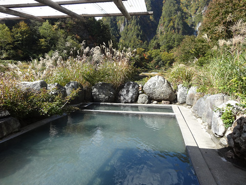 景勝地として名高い蓬莱峡の宇連川沿いに広がっており 日本百名湯に選ばれている。