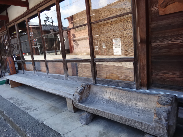バス停の看板も彫刻 バスの待合の椅子も木彫り