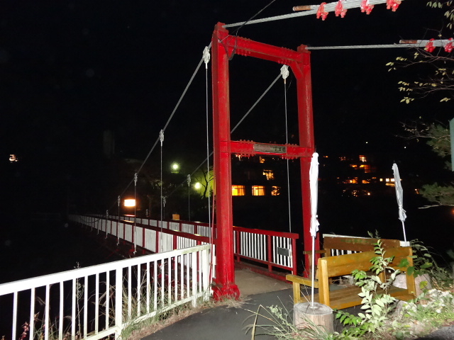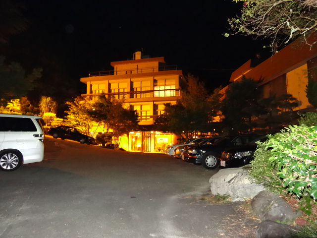 橋を渡ると小奇麗な旅館が浮かび上がる 結構多くの車が止まっている