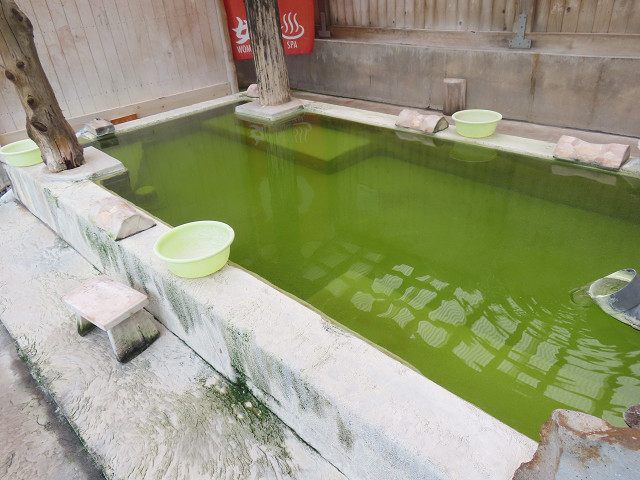 源泉は無色透明ですが成分中に藻(植物9の一種が含まれており、紫外線に当たると