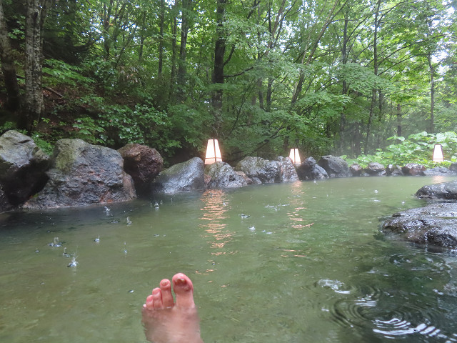 雨混じりで少し温度が低いが いい湯だ