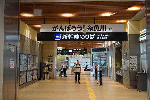 終点糸魚川駅はローカルの横に北陸新幹線ホームがある