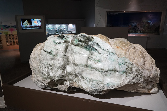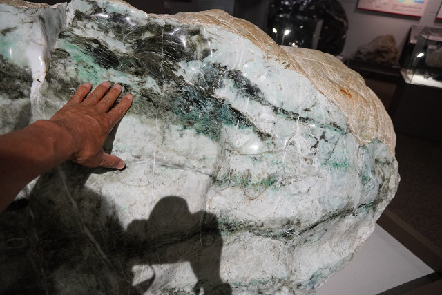 ミュージアムの前庭の噴水池には大きな翡翠の原石