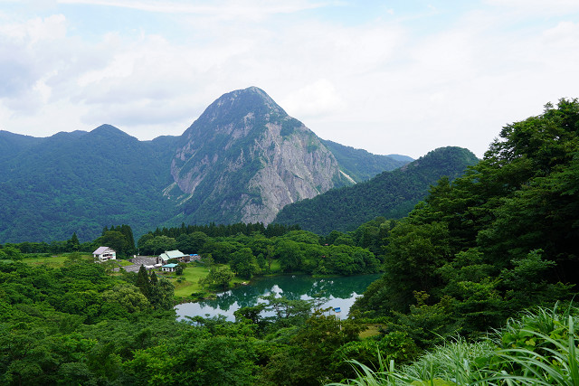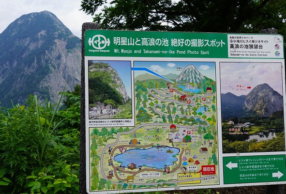 全体が石灰石の山「明星山」400m その下が「高浪の池」 絶景撮影ポイント