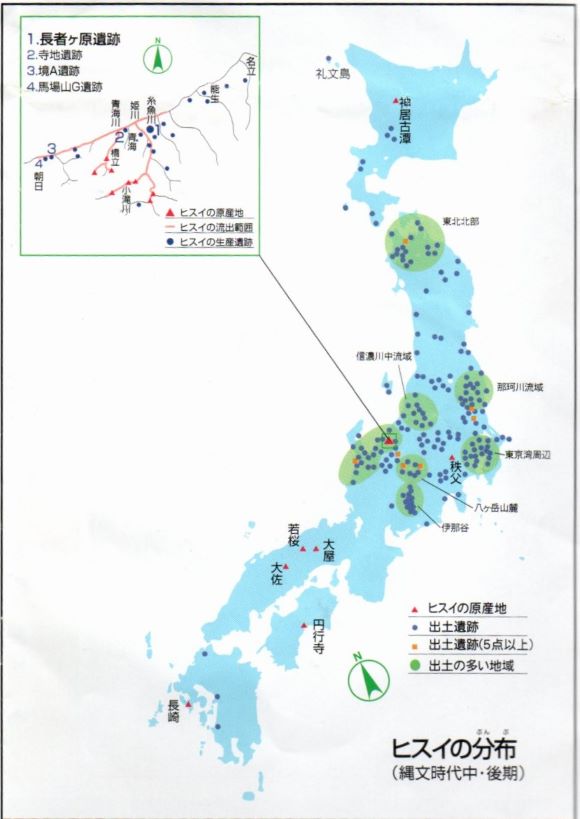 ヒスイの産地は列島の数か所で確認されていますが、ヒスイ加工遺跡を伴うのは糸魚川地方に