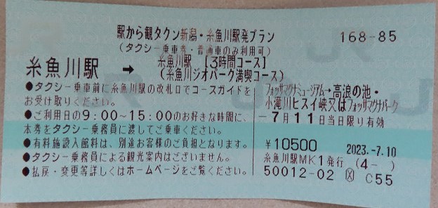 明日の観光タクシーはJRの企画で地元のタクシー会社を使って糸魚川観光が安く出来るというもの