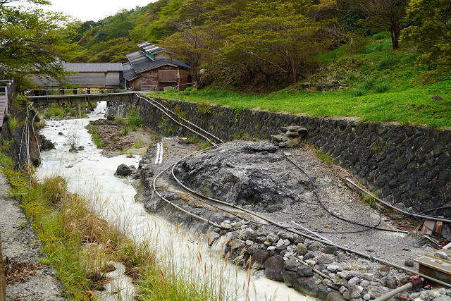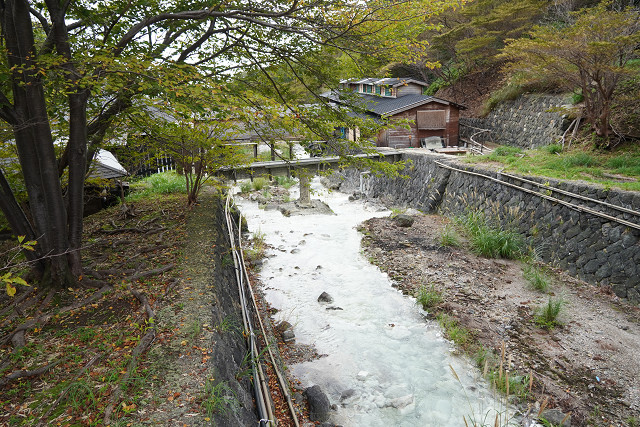 源泉にくるまでの川は透明だが 源泉からこぼれる硫黄泉で川は白く変色 臭いも変わる