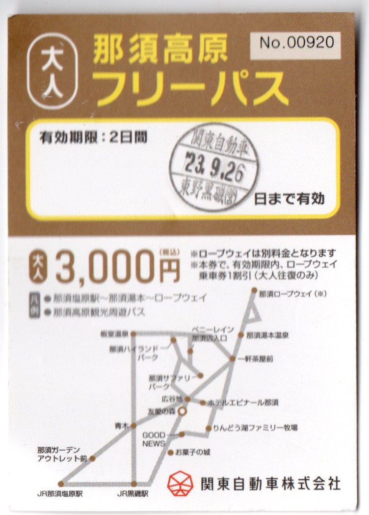 黒磯駅で2日間有効のバスフリーチケット(3000円)を買った この一帯は殆ど「関東バス」である