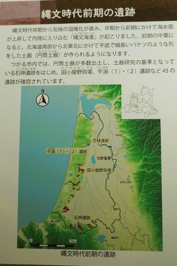 上の解説では「縄文海進」で黄色の部分が湖(旧十三湖)や湿地帯でその縁の高台に集落が出来たんだ