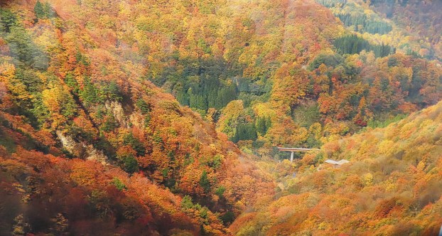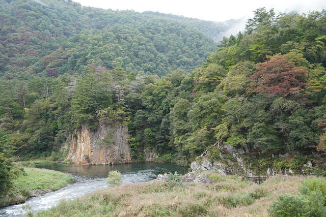 バスは30分ほどで終点見玉に着く ここは川沿いに柱状節理の崖と紅葉で観光地となっている