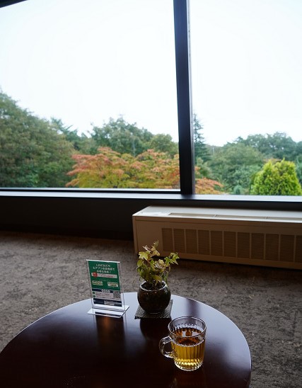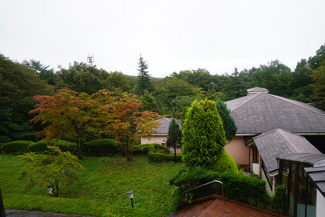 ロビーから庭を見ると手前にレストラン その奥に風呂がある