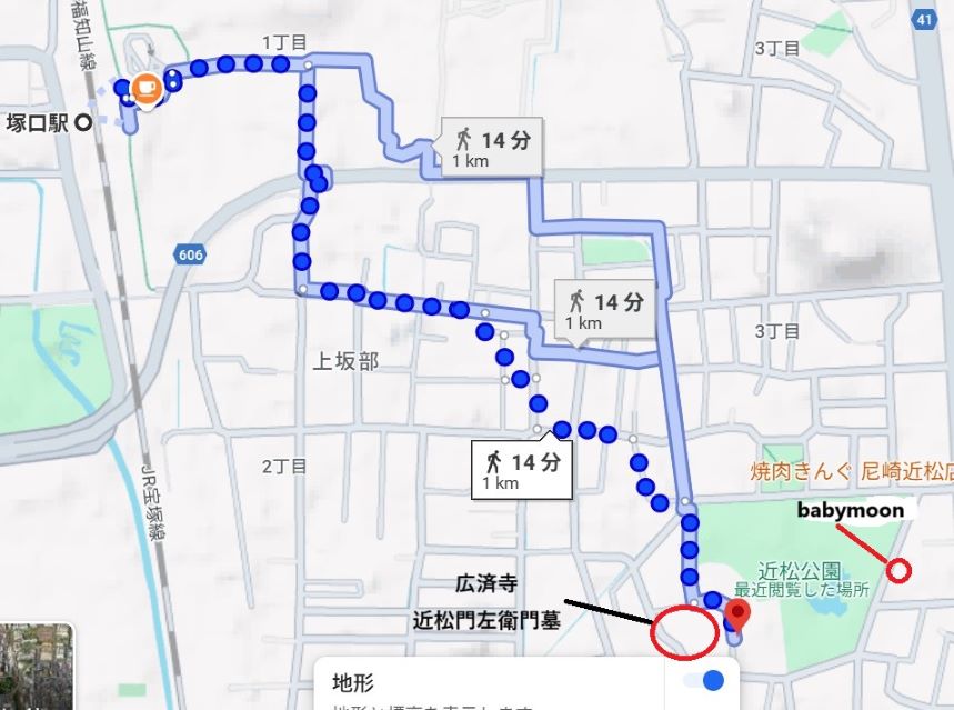 尼崎城に行って近松門左衛門と尼崎市との因縁を知り 墓石に行きたかったが