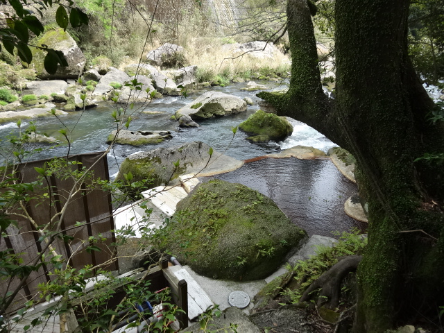 露天風呂の対岸の井戸の筒からお湯が湧き出している もったいないな~