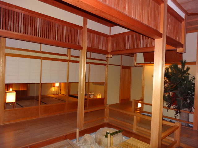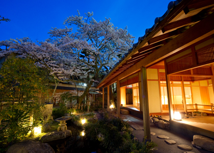 中庭の向うに行灯の明かりに照らされた和風の建物