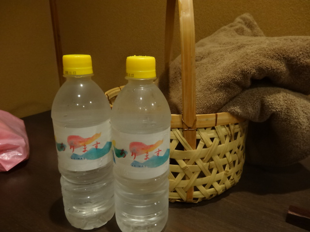 籠にバスタオルとタオルと冷水500ml